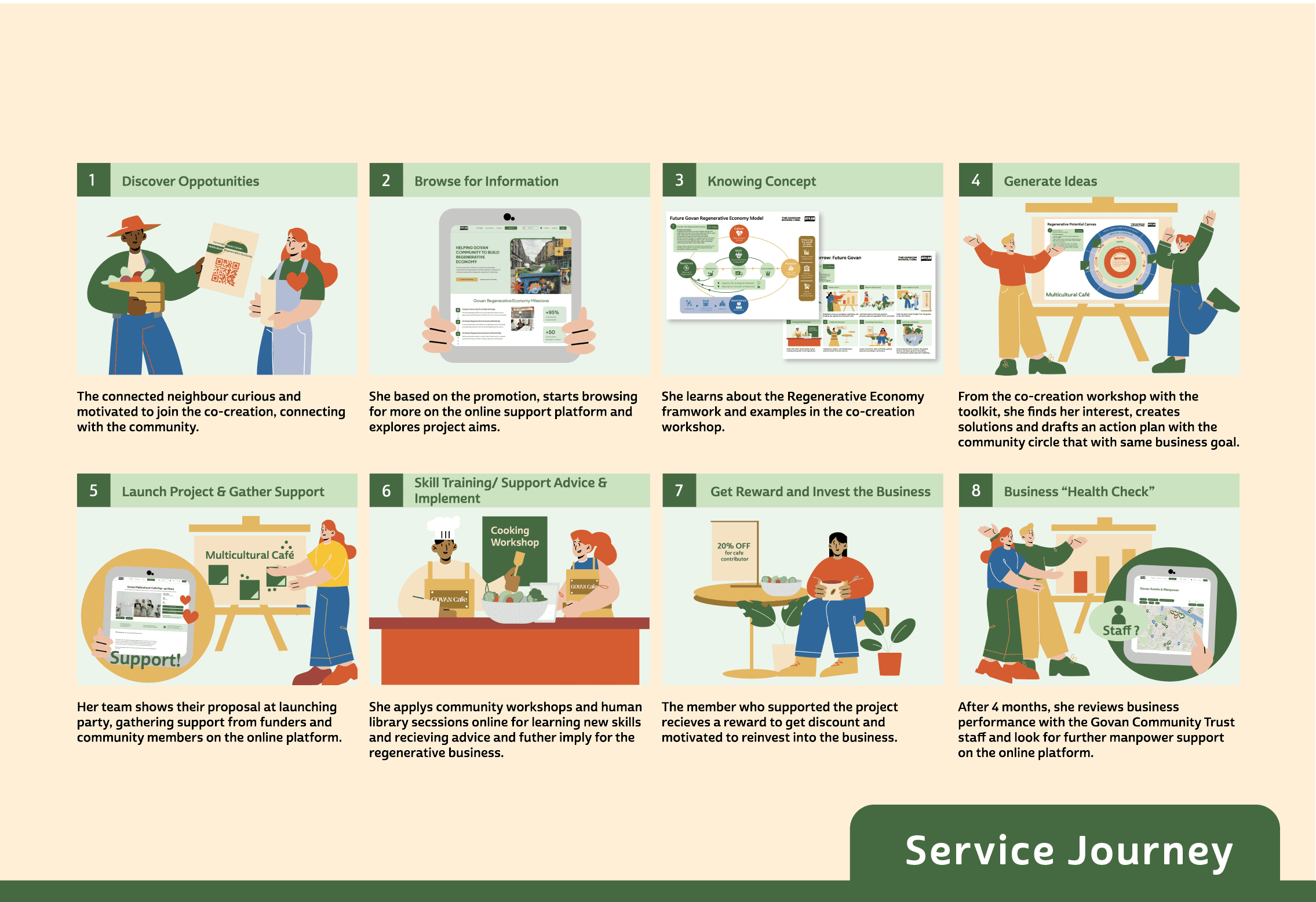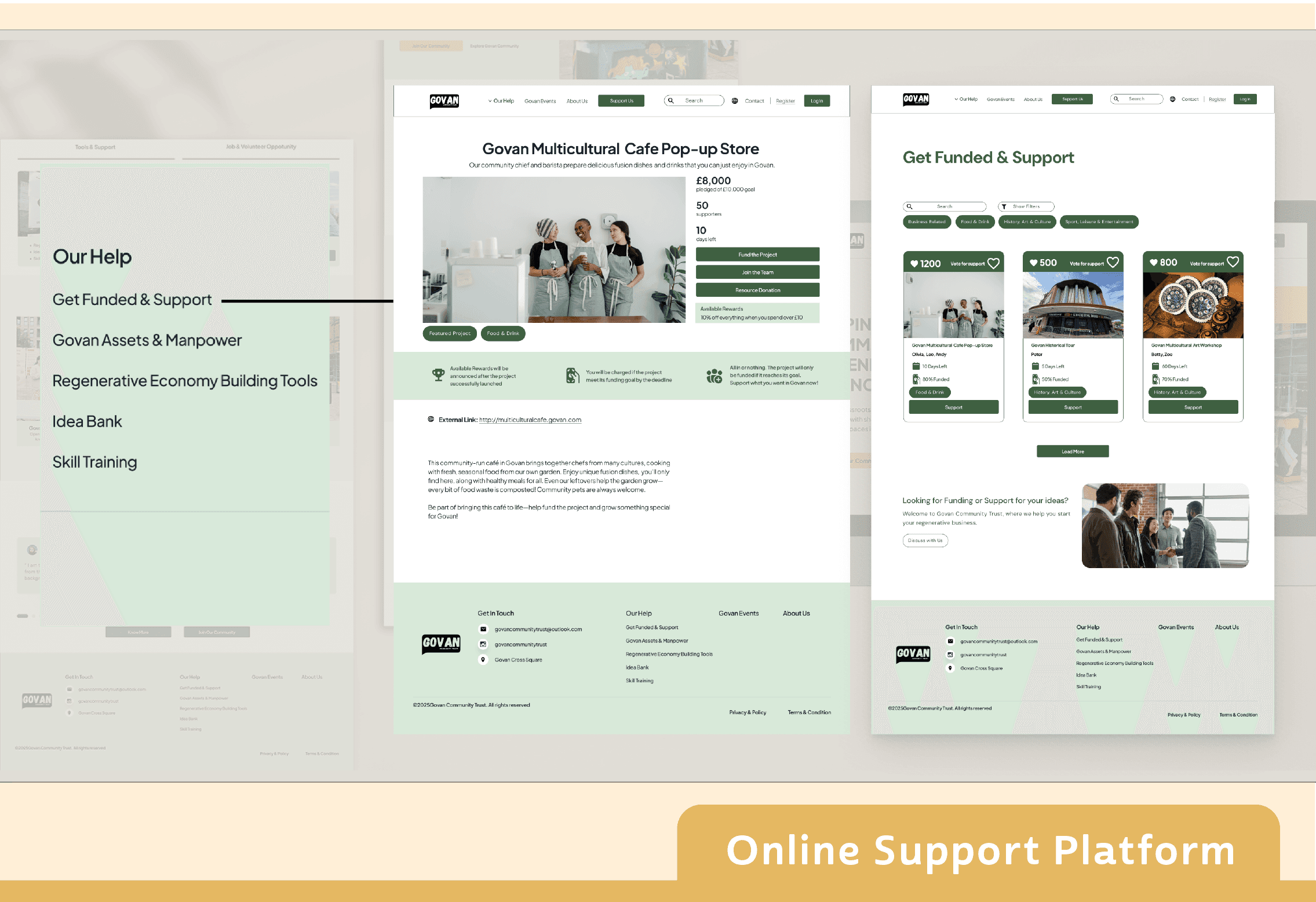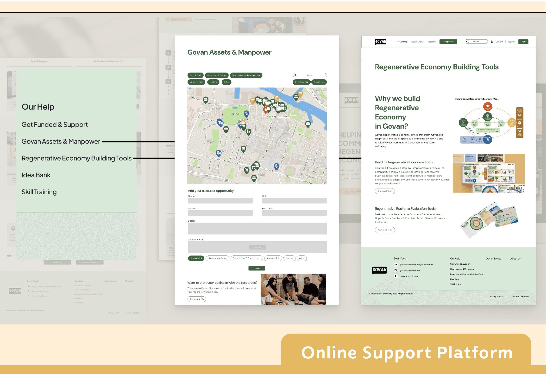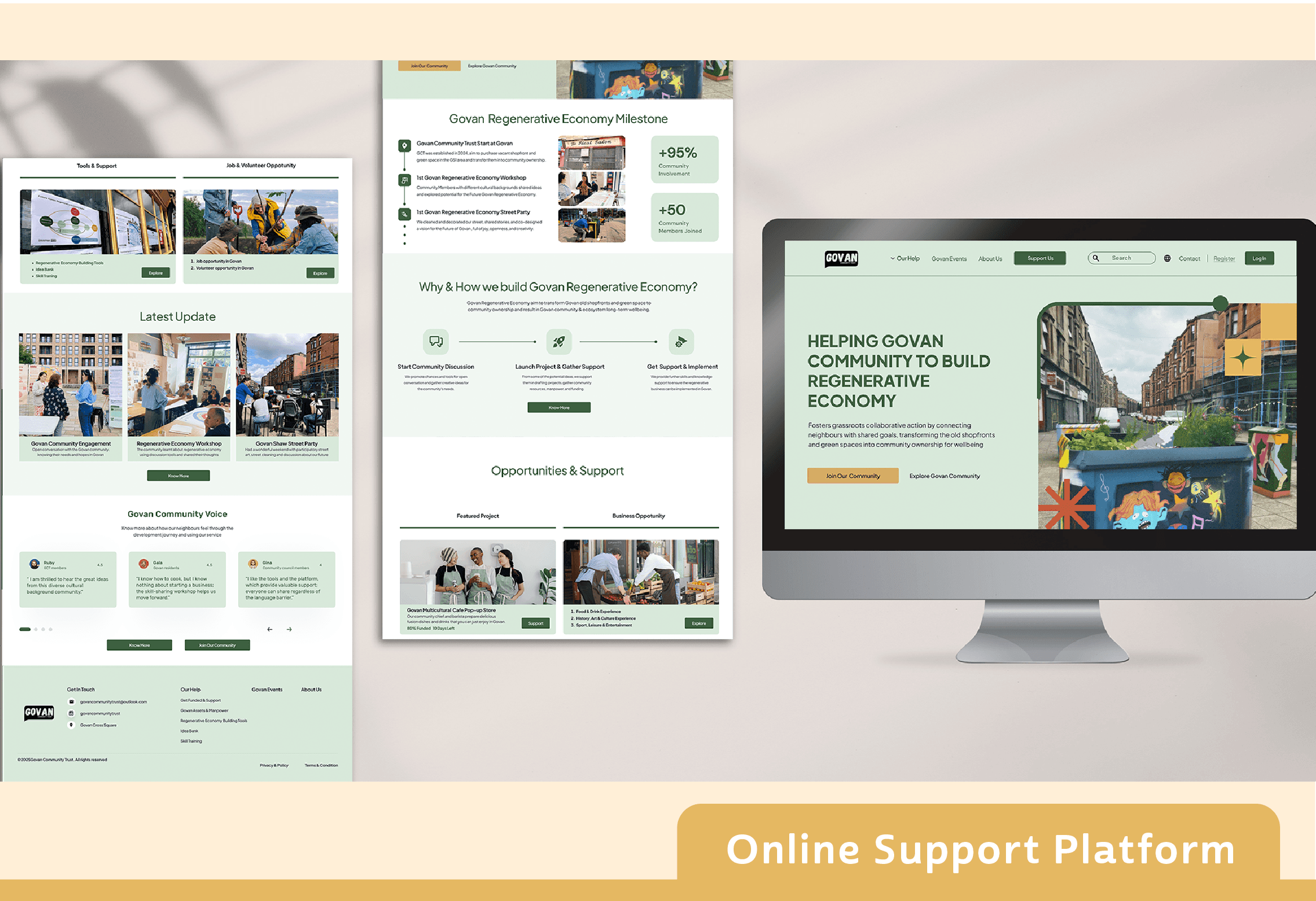 The project addresses two key challenges in Govan: many local businesses and charities serve limited groups and struggle with funding, while others can’t compete with offerings outside Govan, risking closure and future gentrification. Besides, residents have strong views about Govan’s future but lack clear, accessible ways to participate, resulting in passive engagement. Inspired by this, and in partnership with Govan Community Trust, who plan to reclaim local shopfronts and green spaces for community use, I developed the design to foster a multicultural regenerative economy supporting sustainable business and empowering the community.