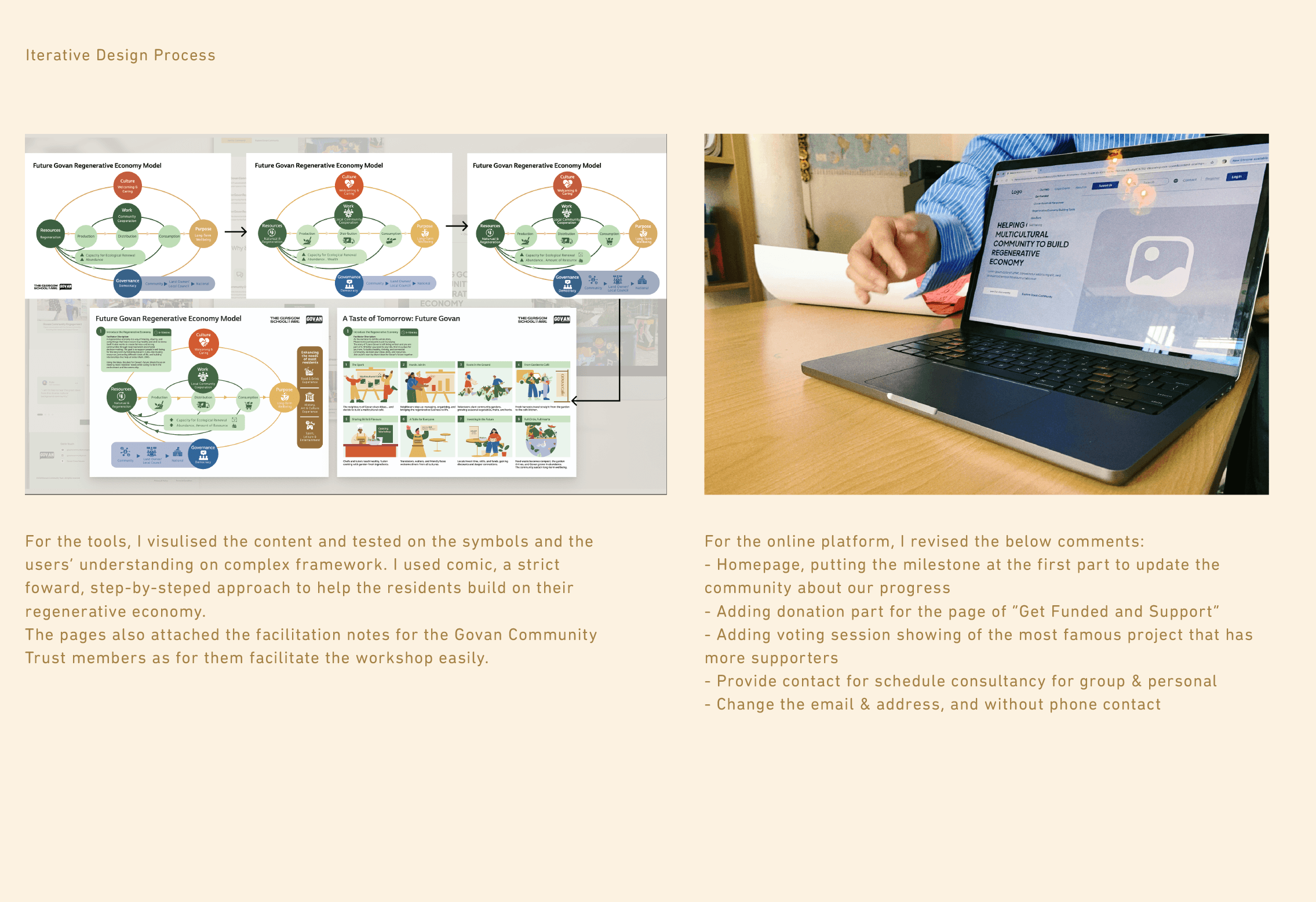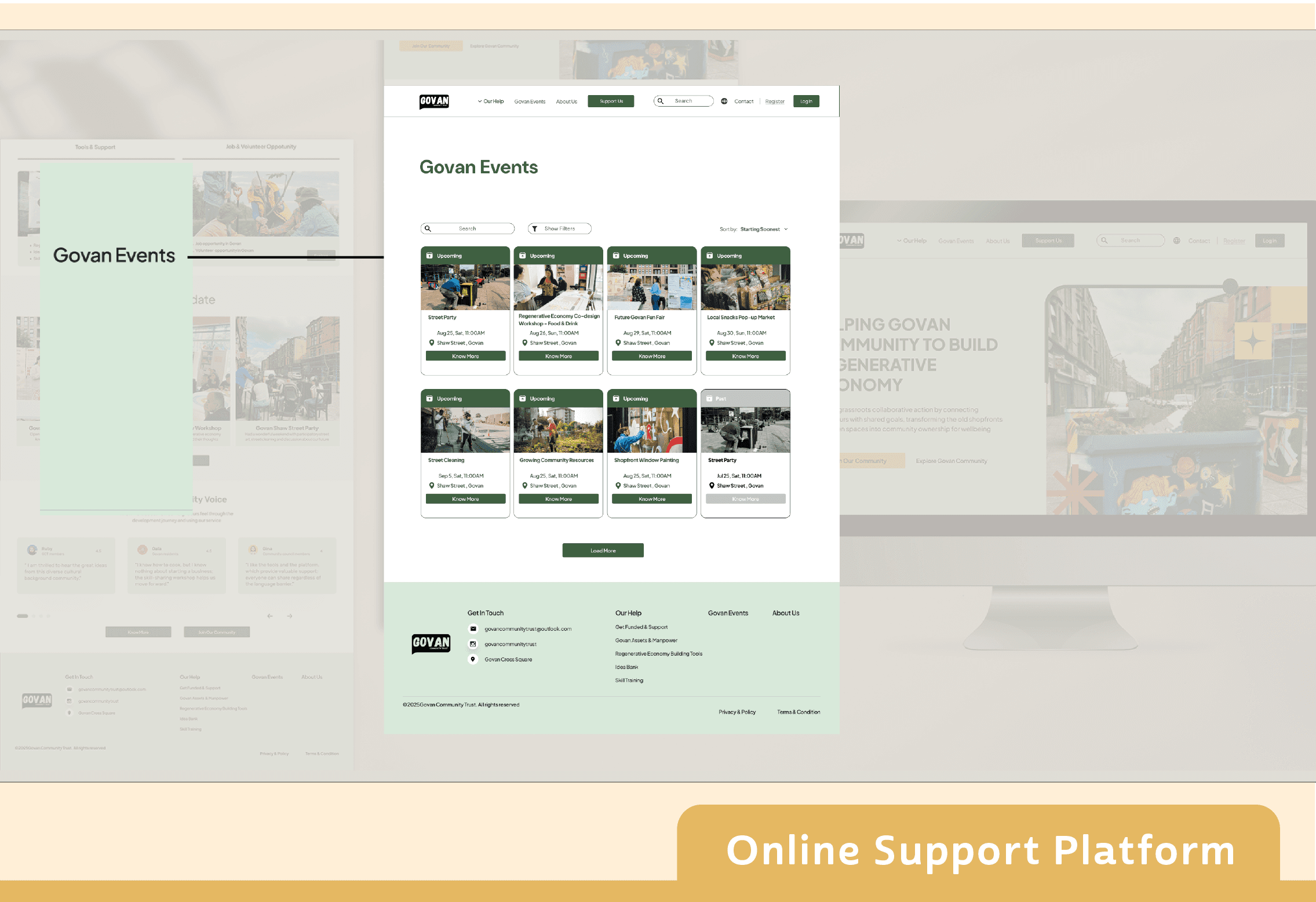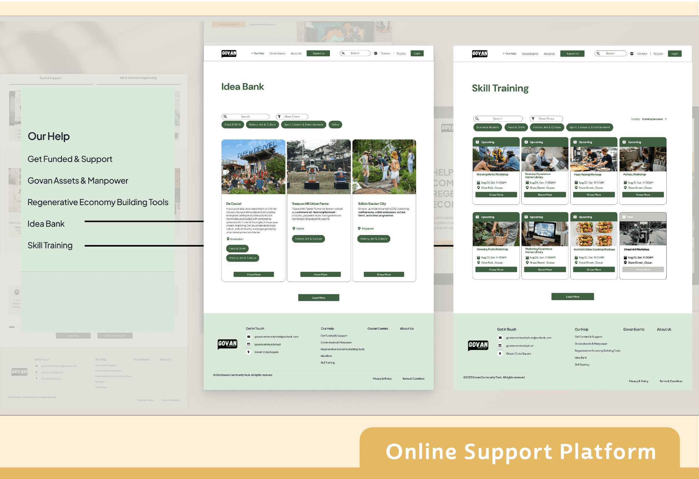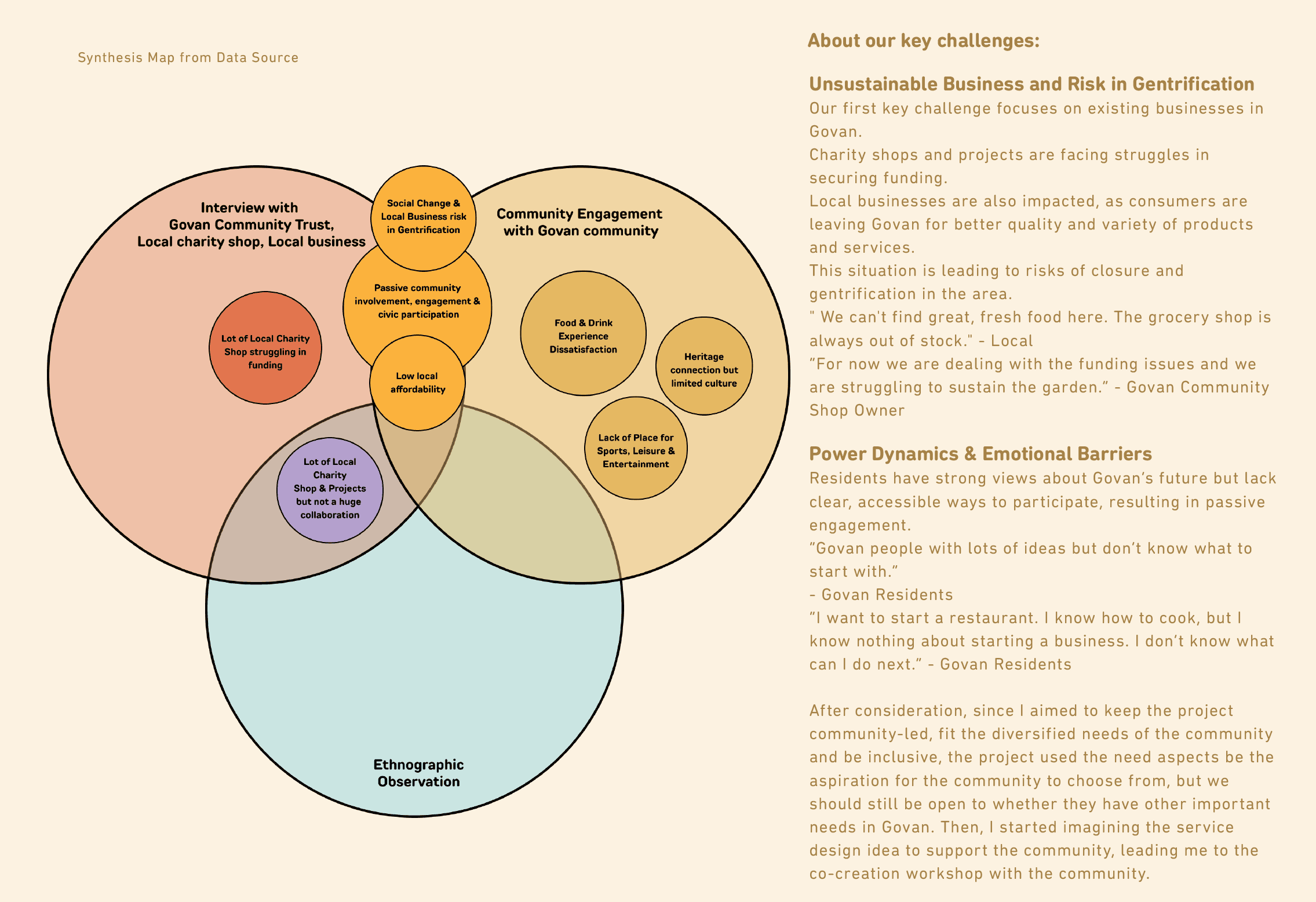 The project addresses two key challenges in Govan: many local businesses and charities serve limited groups and struggle with funding, while others can’t compete with offerings outside Govan, risking closure and future gentrification. Besides, residents have strong views about Govan’s future but lack clear, accessible ways to participate, resulting in passive engagement. Inspired by this, and in partnership with Govan Community Trust, who plan to reclaim local shopfronts and green spaces for community use, I developed the design to foster a multicultural regenerative economy supporting sustainable business and empowering the community.