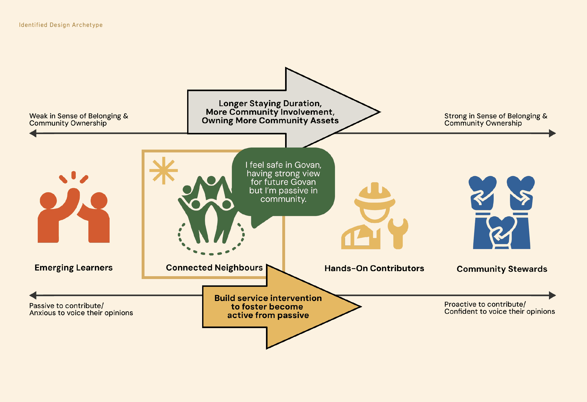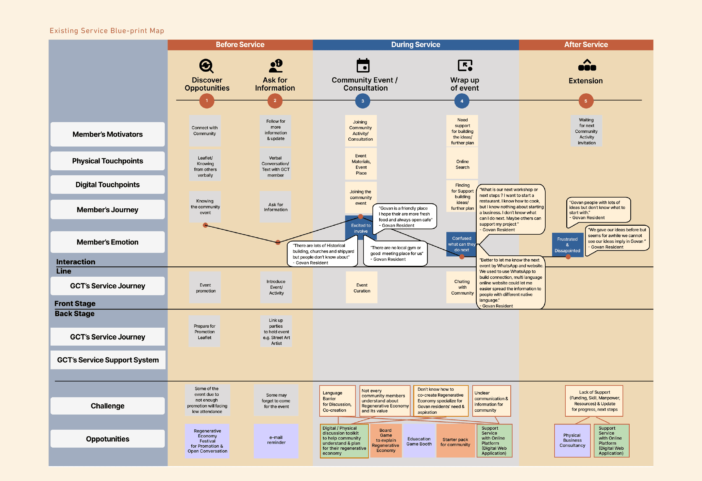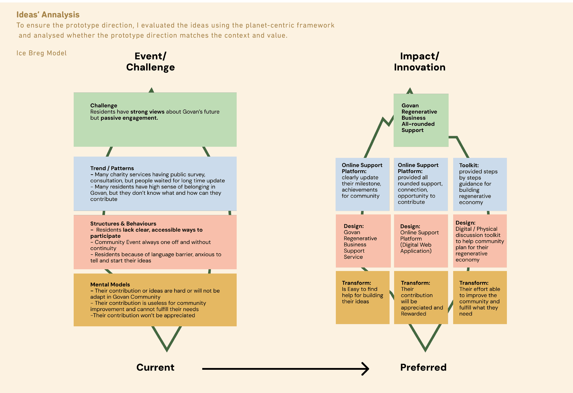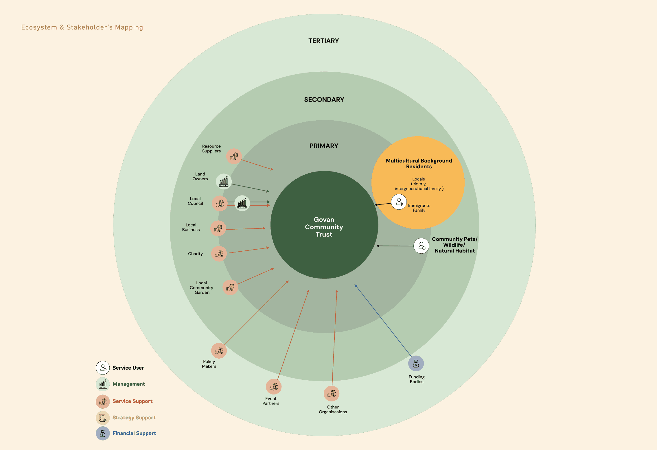 The project addresses two key challenges in Govan: many local businesses and charities serve limited groups and struggle with funding, while others can’t compete with offerings outside Govan, risking closure and future gentrification. Besides, residents have strong views about Govan’s future but lack clear, accessible ways to participate, resulting in passive engagement. Inspired by this, and in partnership with Govan Community Trust, who plan to reclaim local shopfronts and green spaces for community use, I developed the design to foster a multicultural regenerative economy supporting sustainable business and empowering the community.